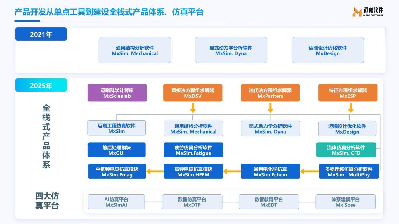 迈曦软件的产品从最初开发的通用结构分析软件、显式动力学分析软件、优化设计软件,到如今覆盖显/隐式、优化设计、疲劳、流体、多物理场仿真分析软件的全栈式产品体系以及AI仿真、数智仿真、数智教育、体系建模四大仿真平台的搭建,完成了从“单点工具”到“平台生态”的跨越,更赢得了越来越多的行业认可。