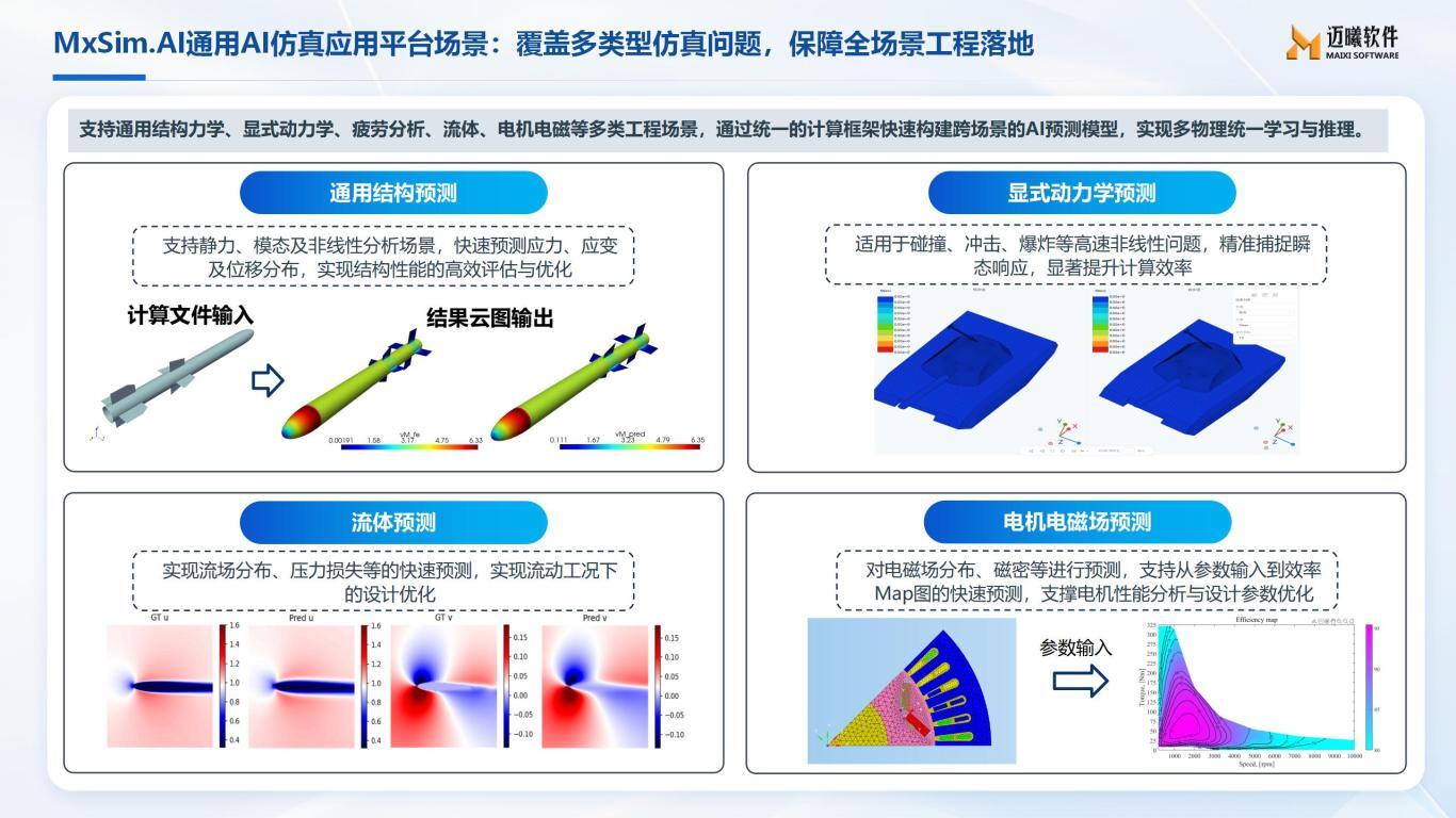 迈曦软件的技术渊源可追溯至湖南大学组建的汽车CAE团队。30余年技术积累叠加公司成立5年来的持续攻关,如今的迈曦软件已打造出一套“能打硬仗”的全栈式CAE产品体系,更用底层创新解决了行业长期困扰的“建模难、算不快、算不稳、内核差、耦合难、学不会”6 大痛点。通用CAE产品中,MxSim.Mechanical是国内功能最完善且能高效解决千万级工程非线性、动力学高难度问题结构仿真分析软件,疲劳仿真分析软件MxSim.Fatigue独特的拖拽式界面和专业材料数据库,从载荷转换到寿命计算的全流程,工程师不用再为复杂操作发愁;全流程支持GPU并行计算的显式动力学仿真软件MxSim.Dyna直接提速汽车碰撞、装备跌落这类大变形、复杂接触的仿真难题的计算效率;AI仿真开发平台MxSim.AI能实现“秒级预测”,让工程师告别“等结果”的焦虑,产品决策更迅速。