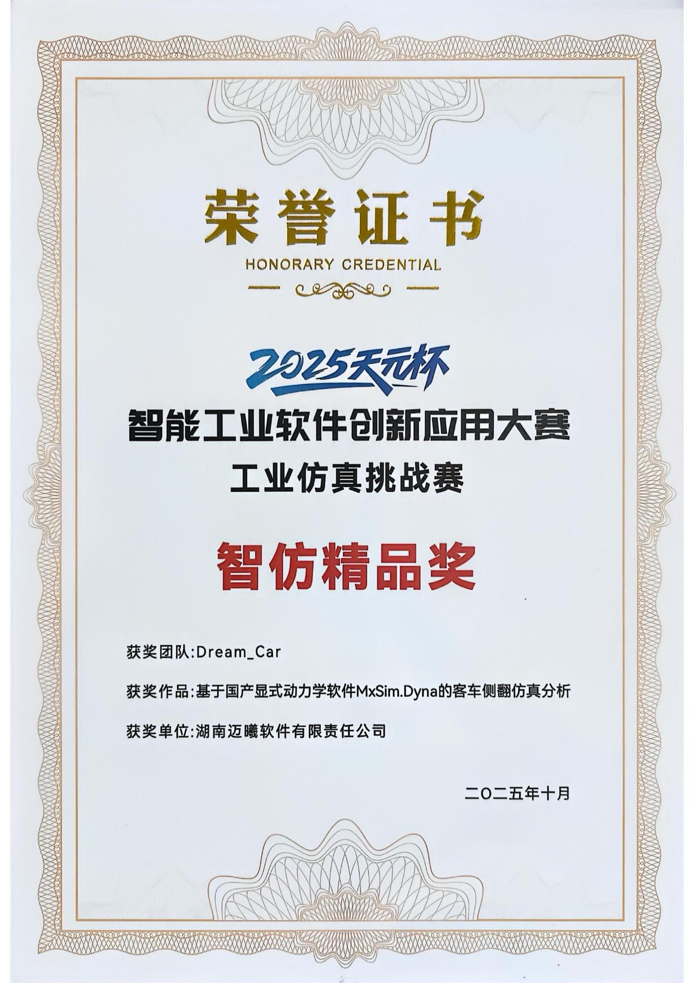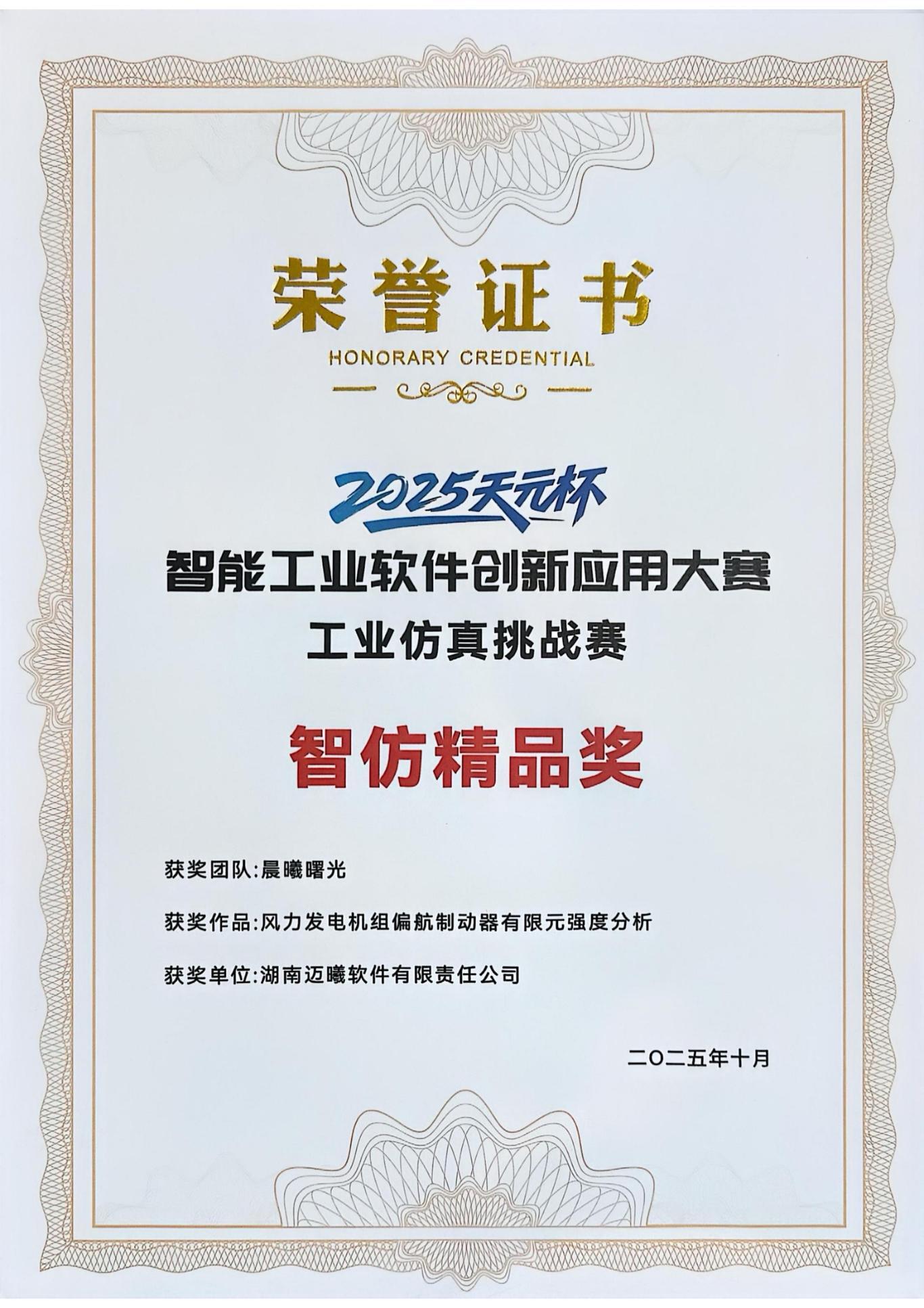 10月23日,2025工业软件创新发展大会在株洲隆重举行。本次盛会汇聚了政、产、学、研、用各界的顶尖力量,共同擘画中国工业软件高质量发展的新蓝图,同时举行了“2025天元杯智能工业软件创新应用大赛”颁奖典礼,迈曦软件“风力发电机组偏航制动器有限元强度分析”、“基于国产显式动力学软件MxSim.Dyna的客车侧翻仿真分析”两个案例均荣获智仿精品奖。