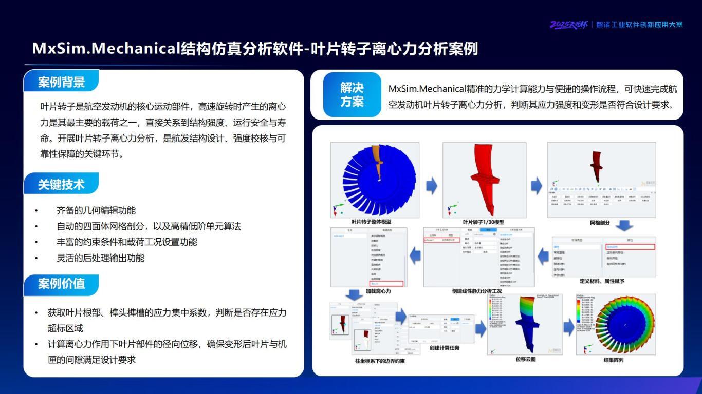 思想的碰撞是为了更好地指引实践。在“智能工业软件解决方案供需对接会” 上,迈曦软件从“论道者”化身为“实干家”,迈曦软件工程师廖中亮通过讲解动车刮雨器结构仿真、高铁转向架优化设计、航空发动机叶片转子离心力分析等仿真案例,生动展示了迈曦结构仿真分析软件、显式动力学分析软件、疲劳仿真分析软件在提升仿真效率、降低计算资源消耗、实现设计自动化等方面的显著优势。